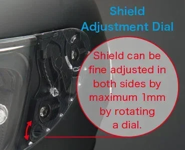 For a shield system securing easy and firm fixing and removing as well as high airtightness in variable axis double action mechanism, QR-E is introduced and enables easy and fine adjustment of a shield. The vortex generator on both sides of a shield is effective for improving aerodynamic performance and reducing wind noise.